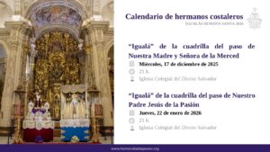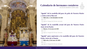 Informamos de las fechas para las “igualás” de las cuadrillas de hermanos costaleros para la Semana Santa de 2025. La “igualá” del paso de la 𝐕𝐢𝐫𝐠𝐞𝐧 𝐝𝐞 𝐥𝐚 𝐌𝐞𝐫𝐜𝐞𝐝...