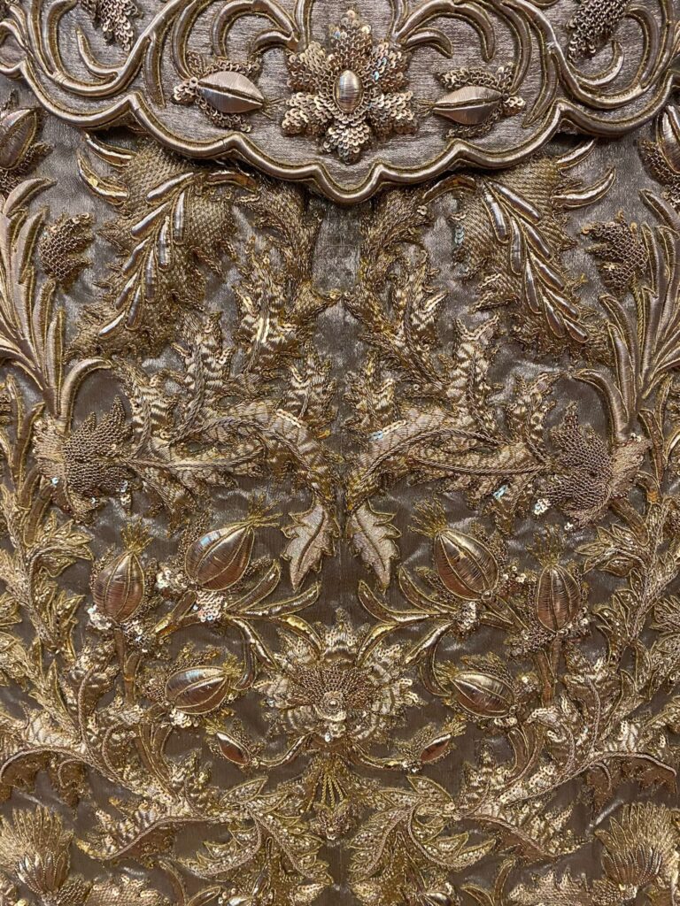 La conservadora-restauradora Gema Pérez Morales ha acometido actuaciones de conservación sobre el tejido de la saya de salida de la Santísima Virgen, una de las mas preciadas joyas bordadas de la Archicofradía. Se trata de una pieza textil insustituible al ser soporte del bordado el traje de novia de nuestra hermana S.A.R. Dña. María de las Mercedes de Borbón, condesa de Barcelona.