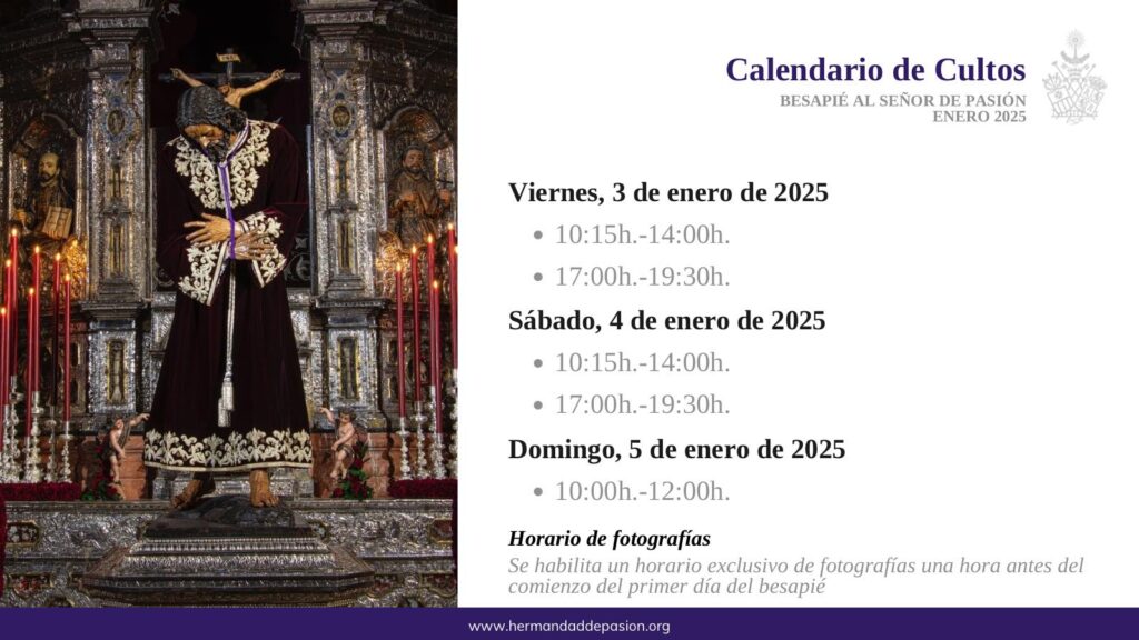 La sagrada imagen de Nuestro Padre Jesús de la Pasión estará expuesta en devoto besapié durante los días 3, 4 y 5 de enero en los horarios que se indica en el cartel.