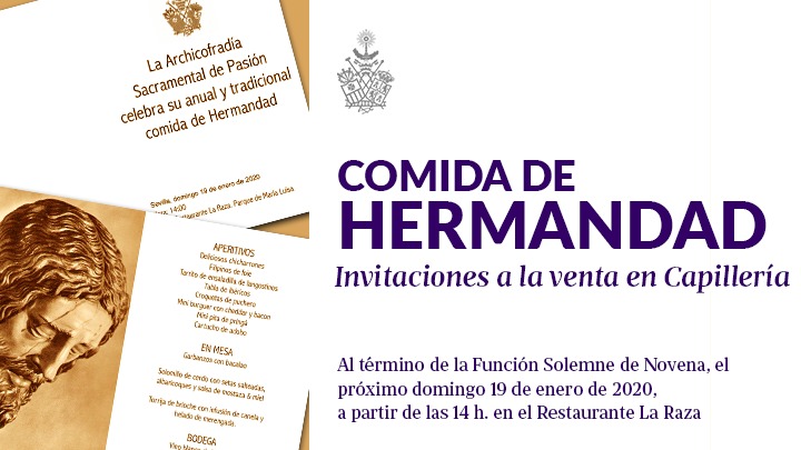 Recordamos a nuestros hermanos que en Capillería pueden adquirirse las invitaciones para la comida de hermandad que, como es tradicional, celebraremos tras la Función Solemne del próximo domingo 19, que se servirá un año más en las magníficas instalaciones del Restaurante La Raza (Av. de María Luisa, s/n)..