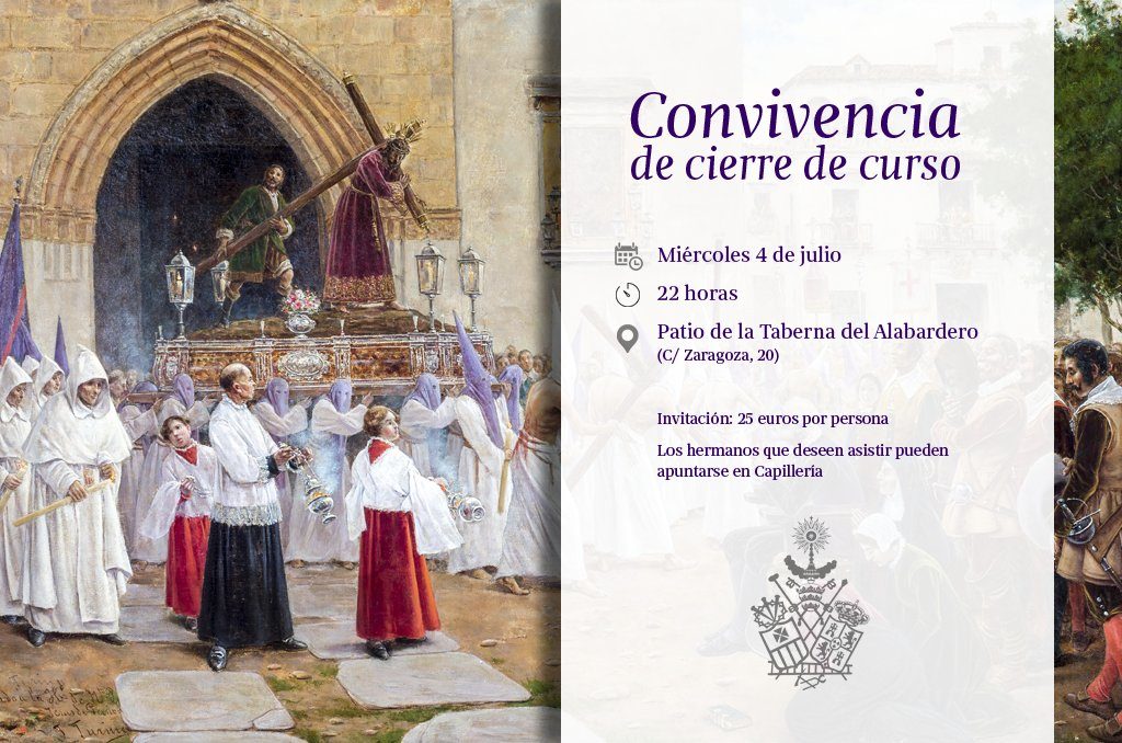 El miércoles 4 de julio, celebraremos la tradicional convivencia de cierre de curso. Este año tendrá lugar a las 22 h. en el patio de la Taberna del Alabardero. Será una excelente ocasión para celebrar juntos este año extraordinario para la Hermandad.