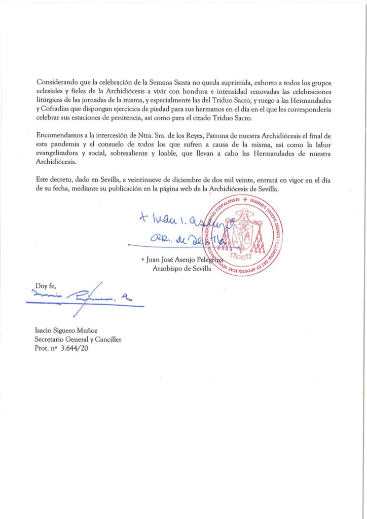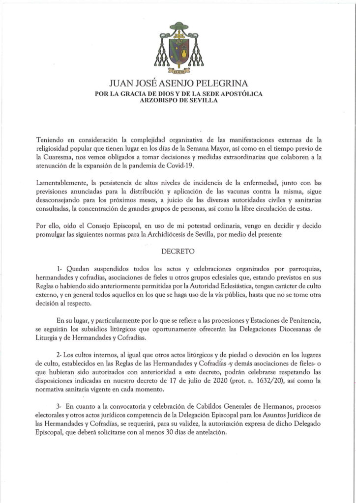 Decreto del Arzobispo de Sevilla, monseñor Juan José Asenjo Pelegrina