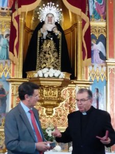 En cumplimiento del Decreto del Arzobispado que dispone que los Directores Espirituales de las HH. y CC. sean sus párrocos o los responsables directos de sus sedes canónicas, el cargo de Director Espiritual de nuestra Archicofradía ha recaído en NHD. Eloy Caracuel García de Toledo, Rector de la Iglesia Colegial. Por ello, un buen número de miembros de la Junta de Gobierno de nuestra Hermandad y de hermanos y hermanas de nuestra Archicofradía homenajeamos y despedimos ayer a NHD. Florentino Córcoles, párroco de Santiago de Castilleja de la Cuesta, agradeciéndole los años en los que ha desempeñado ese cargo, siempre a la disposición de la Hermandad con un enorme cariño. Tras una emotiva Eucaristía en su parroquia, el Hermano Mayor hizo entrega a nuestro querido don Florentino de una medalla en plata del Centenario del Señor, y posteriormente los asistentes compartimos una cena en su homenaje, tras la que don Florentino, con su amabilidad y afecto que le caracteriza, nos reiteró su plena disposición a atender a los hermanos de Pasión que le puedan necesitar. Con mucho afecto y el mejor recuerdo, le deseamos lo mejor para el futuro, rogando a nuestros Sagrados Titulares le devuelvan tanto como nuestro querido don Florentino ha entregado a nuestra Hermandad durante estos últimos siete años.