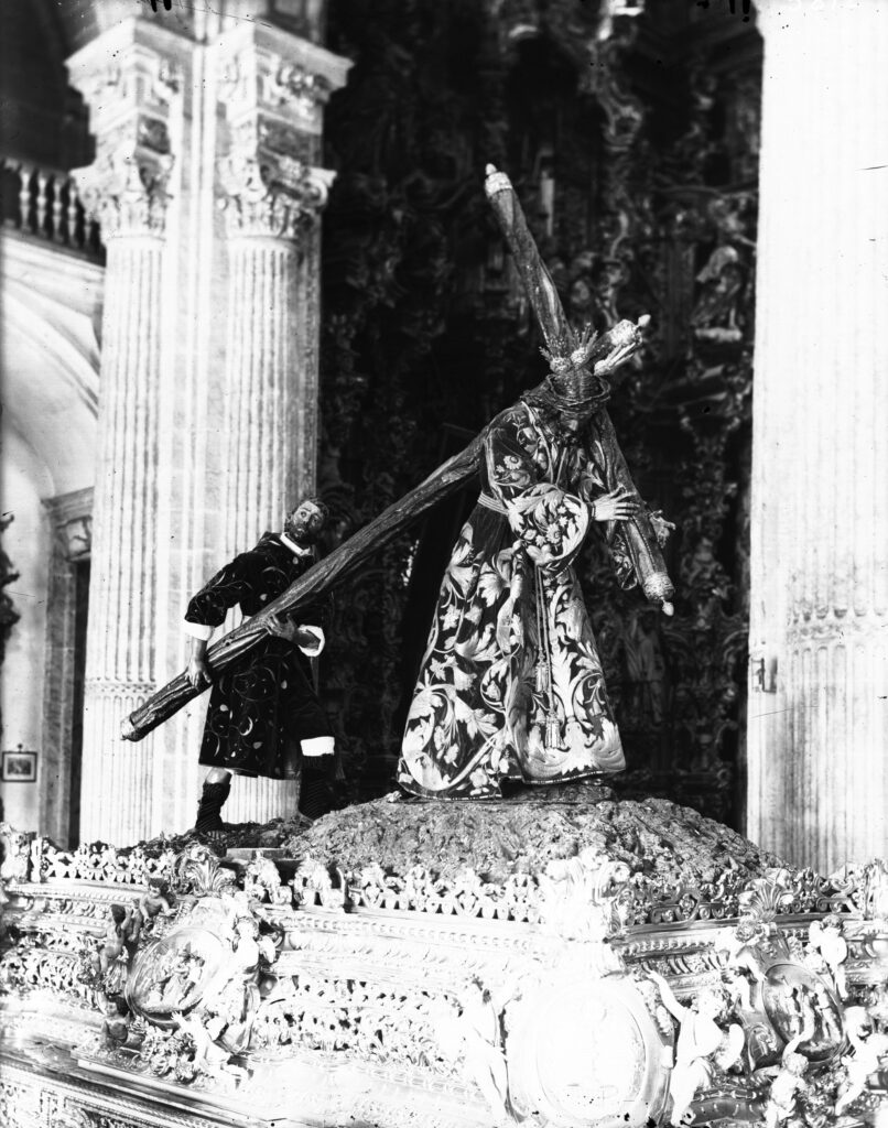 Deseosos de construir un nuevo paso procesional para la imagen de Nuestro Padre Jesús de la Pasión, los cofrades reunidos en cabildo general el 8 de abril de 1900 escogieron el dibujo presentado por el escultor Pedro Domínguez López (1861-1900), frente a las propuestas de Emilio Pizarro y Joaquín Andrade, que no prosperaron. En aquella misma sesión capitular se comunicó que, de inmediato, el artista designado elevaría el diseño a escala natural, completándolo con los candelabros que no aparecían reflejados en el proyecto inicial, recibiendo como retribución por este quehacer una suma de 1.000 pesetas. En cuanto a su futura materialización, se acuerda pedir de manera extraoficial informes y valoraciones económicas tanto al propio Domínguez como “a las casas más serias e importantes que se dedican a esta clase de trabajos”, adjudicándose a quien “bajo su firma se comprometa a hacerlo de lo más rico y económico, contando que la dirección de la obra hasta quedar completamente terminada estará a cargo de los Sres. D. Joaquín Díaz y D. Pedro Domínguez”.