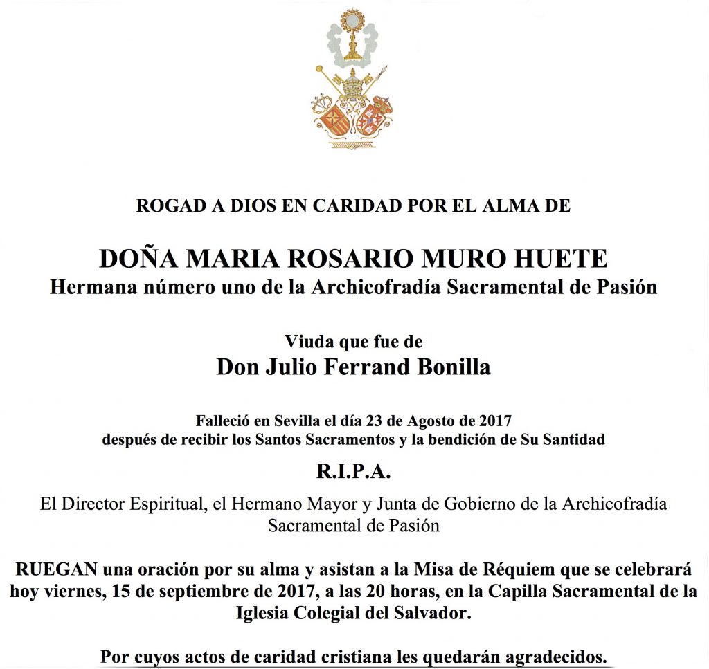 Hoy viernes, día 15 de septiembre, en la capilla Sacramental y ante nuestros sagrados titulares, celebraremos la Misa de Hermandad terminando con el canto de la Salve en honor a Nuestra Madre y Señora de la Merced. La misma será aplicada por el alma de NªHªDª Rosario Muro Huete