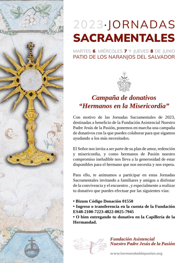 Todo lo recaudado en estas Jornadas, que se extenderán hasta el mismo día del Corpus Christi, se destinará a la Fundación Asistencial Nuestro Padre Jesús de la Pasión. Como ya se hiciera el año pasado, este carácter benéfico de la celebración se verá reforzado este año con una campaña de recogida de donativos on line para quienes no puedan asistir a las Jornadas.