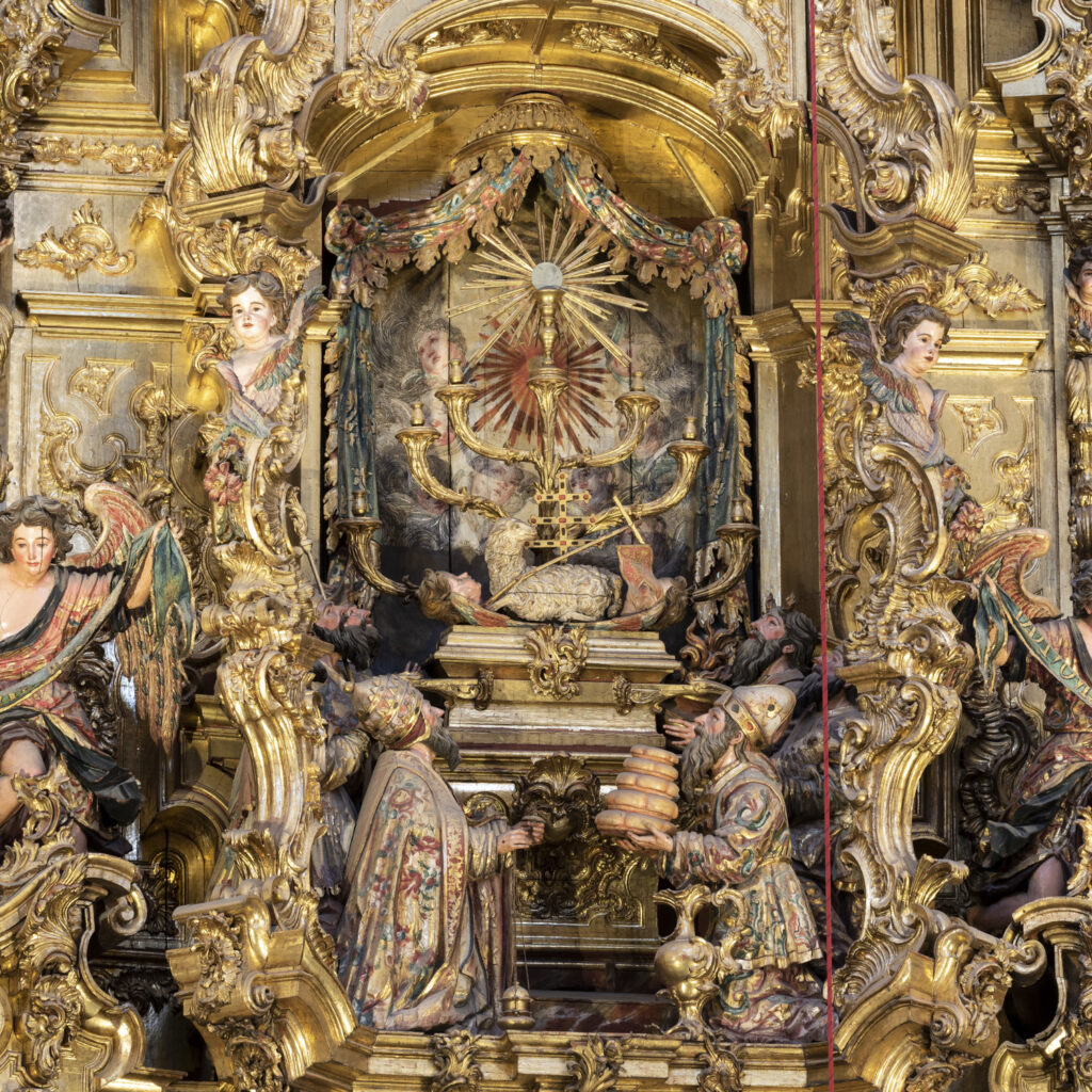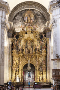 El retablo que preside el acceso a la Capilla Sacramental es la primera de las obras que el retablista y escultor portugués Cayetano de Acosta realiza para la Colegial entre 1756 y 1764, y por su programa iconográfico dedicado a la Exaltación de la Eucaristía, su calidad artística, sus colosales dimensiones y su singular resolución arquitectónica, es considerada su obra cumbre y denominada “la apoteosis del barroco”.