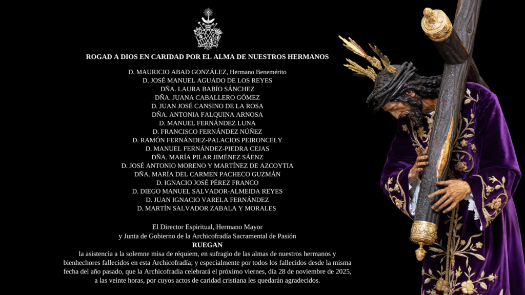 Elevaremos nuestra oración comunitaria ante Nuestro Padre Jesús de la Pasión, implorando el descanso eterno de quienes nos precedieron en la fe y agradeciendo su testimonio, entrega y amor a esta Archicofradía.