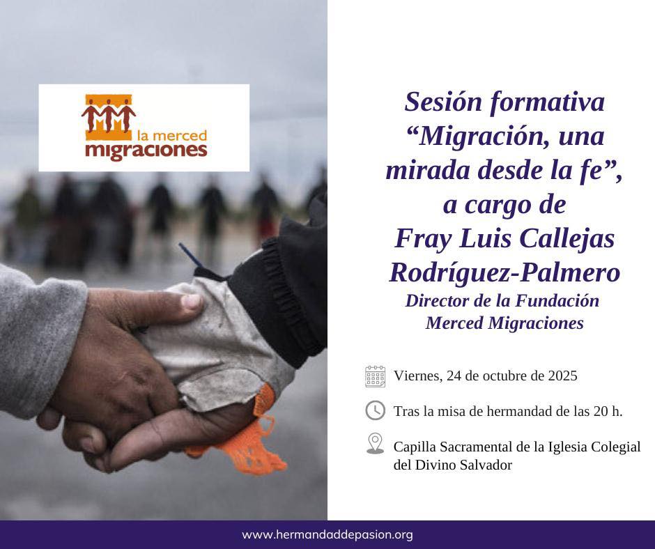Hoy viernes 24 de octubre tras la Misa de Hermandad a las 20h. celebraremos una interesante sesión formativa dirigida por 𝐟𝐫𝐚𝐲 𝐋𝐮𝐢𝐬 𝐂𝐚𝐥𝐥𝐞𝐣𝐚𝐬 𝐑𝐨𝐝𝐫𝐢́𝐠𝐮𝐞𝐳-𝐏𝐚𝐥𝐦𝐞𝐫𝐨, mercedario y director de la Fundación La Merced Migraciones, que versará sobre la “𝐌𝐢𝐠𝐫𝐚𝐜𝐢𝐨́𝐧, 𝐮𝐧𝐚 𝐦𝐢𝐫𝐚𝐝𝐚 𝐝𝐞𝐬𝐝𝐞 𝐥𝐚 𝐟𝐞“.