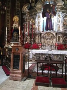 Tras la reforma del altar, con la alineación de las peanas de la Santísima Virgen y San Juan en el mismo plano que el Señor, la ornamentación de la Capilla Sacramental se completa con este nuevo ambón para el altar, realizado en mármol siguiendo el trazado ornamental y los colores de la Capilla, según diseño del estudio de arquitectura de Fernando Mendoza.