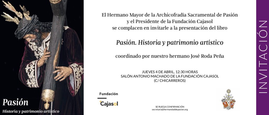 El próximo jueves 4 de abril se presentará en la sede de la Fundación Cajasol, a las 12:30 h., el libro ‘Pasión. Historia y patrimonio artístico’, dedicado a nuestra Archicofradía. Una magna obra que ha sido coordinada por nuestro hermano José Roda Peña y que cuenta con las firmas de prestigiosos historiadores y especialistas en diversas materias históricas y artísticas, además de la coordinación gráfica y fotografía de nuestro hermano Daniel Salvador-Almeida González.