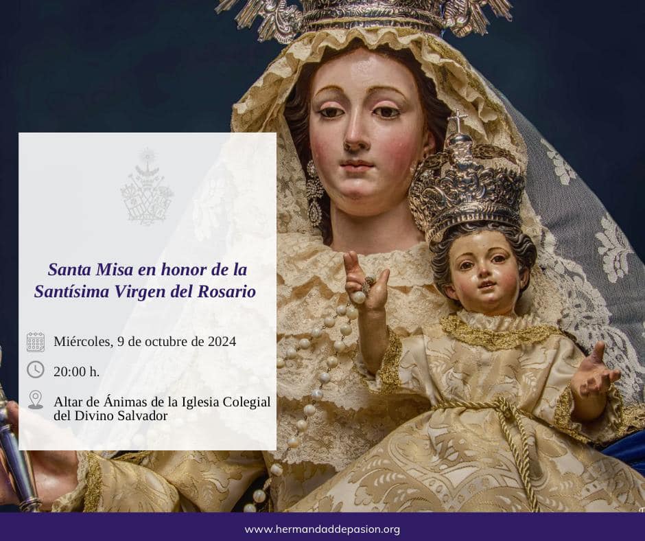 El próximo miércoles, 9 de octubre de 2024, a las 20 horas celebraremos Santa Misa en honor de la Santísima Virgen del Rosario en el Altar de Ánimas de la Iglesia Colegial del Divino Salvador, donde recibe culto.