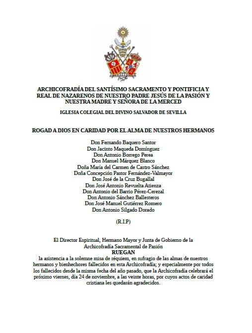 Conforme a nuestras Reglas, hoy viernes, último del mes de noviembre, celebraremos Santa Misa en sufragio por el alma de nuestros hermanos y bienhechores difuntos, especialmente los fallecidos durante el último año de los que ha tenido conocimiento la Hermandad. Comenzará a las 20 h. ante el Altar de Ánimas, presidido por el Señor de los Afligidos.