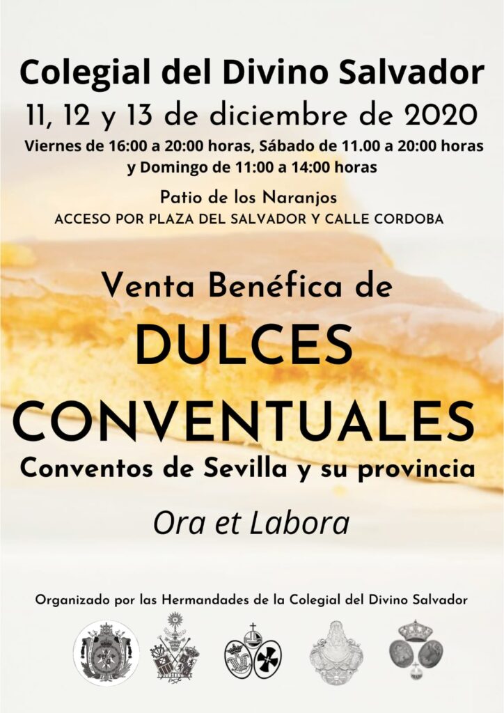 Los próximos días 11, 12 y 13 de diciembre de 2020 llevaremos a cabo de manera conjunta con las hermandades de la Colegial una campaña de venta de dulces conventuales que se desarrollará en el Patio de los Naranjos del Salvador, y durante la cual podrán adquirise los tradicionales dulces de conventos sevillanos que este año, por la pandemia, no han podido ponerse a la venta en la tradicional cita que se desarrollaba en el Alcázar durante el puente de la Inmaculada.