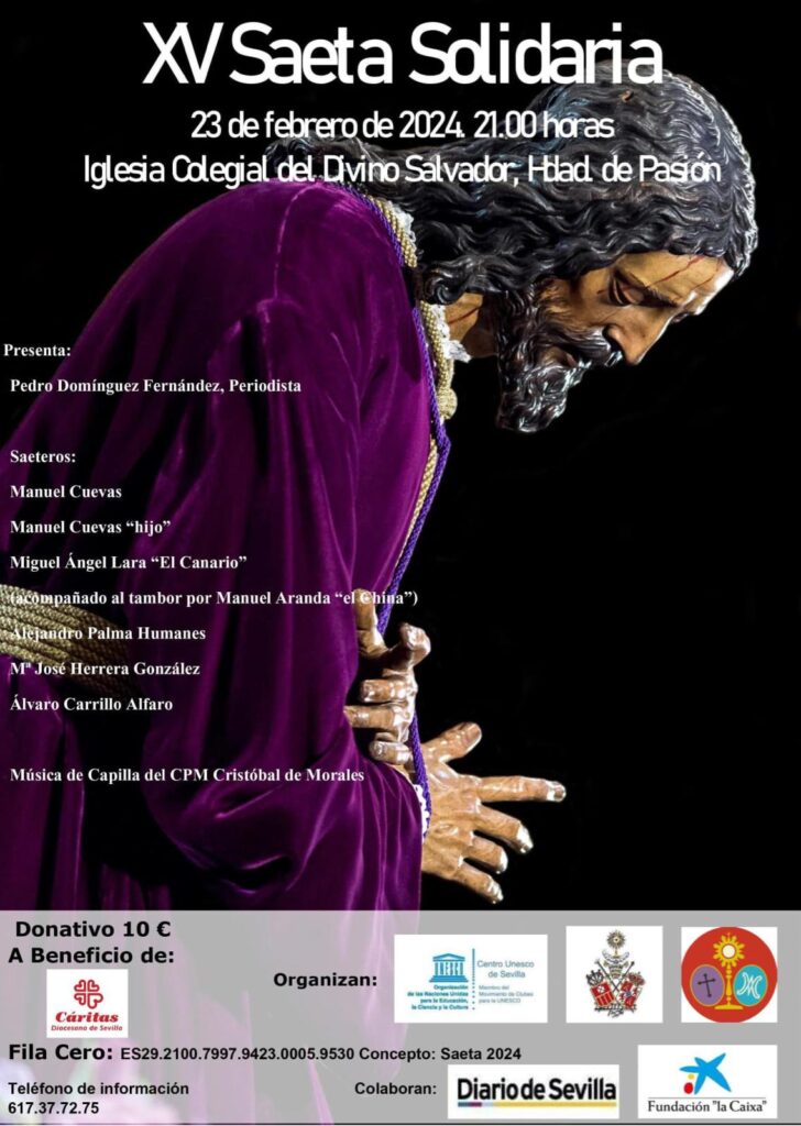 El próximo viernes, 23 de febrero, se celebrará la XV Saeta Solidaria en la Iglesia Colegial del Divino Salvador, organizada, entre otras entidades, por nuestra Archicofradía.